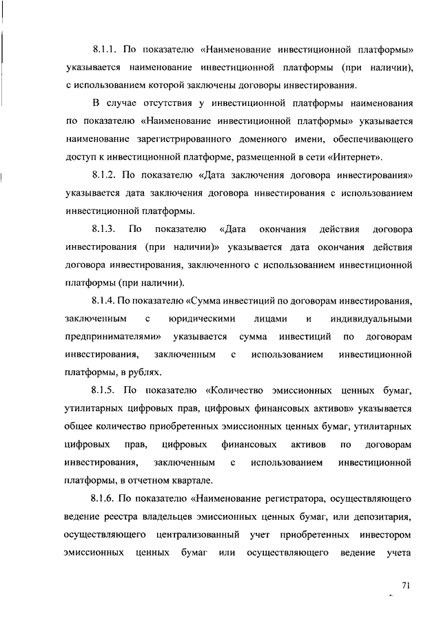 "О ПОРЯДКЕ И СРОКАХ СОСТАВЛЕНИЯ И ПРЕДСТАВЛЕНИЯ (ПРЕДОСТАВЛЕНИЯ) В БАНК РОССИИ ОТЧЕТОВ ОПЕРАТОРОВ ИНВЕСТИЦИОННЫХ ПЛАТФОРМ, ОТЧЕТНОСТИ ОПЕРАТОРОВ ФИНАНСОВЫХ ПЛАТФОРМ, ОПЕРАТОРОВ ИНФОРМАЦИОННЫХ СИСТЕМ, В КОТОРЫХ ОСУЩЕСТВЛЯЕТСЯ ВЫПУСК ЦИФРОВЫХ ФИНАНСОВЫХ АКТИВОВ, И ОПЕРАТОРОВ ОБМЕНА ЦИФРОВЫХ ФИНАНСОВЫХ АКТИВОВ, ФОРМЕ ОТЧЕТОВ ОПЕРАТОРОВ ИНВЕСТИЦИОННЫХ ПЛАТФОРМ И СОСТАВЕ ВКЛЮЧАЕМЫХ В НИХ СВЕДЕНИЙ, СОСТАВЕ И ФОРМАХ ОТЧЕТНОСТИ ОПЕРАТОРОВ ФИНАНСОВЫХ ПЛАТФОРМ, А ТАКЖЕ О ПОРЯДКЕ СООБЩЕНИЯ ОПЕРАТОРАМИ ИНВЕСТИЦИОННЫХ ПЛАТФОРМ, ОПЕРАТОРАМИ ФИНАНСОВЫХ ПЛАТФОРМ, ОПЕРАТОРАМИ ИНФОРМАЦИОННЫХ СИСТЕМ, В КОТОРЫХ ОСУЩЕСТВЛЯЕТСЯ ВЫПУСК ЦИФРОВЫХ ФИНАНСОВЫХ АКТИВОВ, ОПЕРАТОРАМИ ОБМЕНА ЦИФРОВЫХ ФИНАНСОВЫХ АКТИВОВ БАНКУ РОССИИ ИНФОРМАЦИИ О ЛИЦАХ, КОТОРЫМ ПОРУЧЕНО ПРОВЕДЕНИЕ ИДЕНТИФИКАЦИИ, УПРОЩЕННОЙ ИДЕНТИФИКАЦИИ, ОБНОВЛЕНИЕ ИНФОРМАЦИИ О КЛИЕНТАХ, ПРЕДСТАВИТЕЛЯХ КЛИЕНТОВ, ВЫГОДОПРЕОБРЕТАТЕЛЯХ И БЕНЕФИЦИАРНЫХ ВЛАДЕЛЬЦАХ"