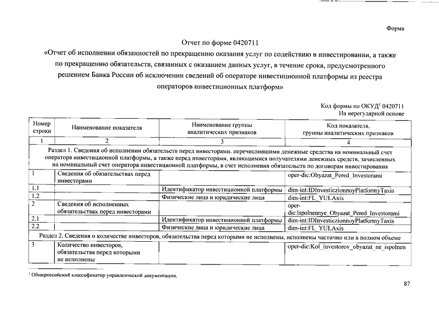 "О ПОРЯДКЕ И СРОКАХ СОСТАВЛЕНИЯ И ПРЕДСТАВЛЕНИЯ (ПРЕДОСТАВЛЕНИЯ) В БАНК РОССИИ ОТЧЕТОВ ОПЕРАТОРОВ ИНВЕСТИЦИОННЫХ ПЛАТФОРМ, ОТЧЕТНОСТИ ОПЕРАТОРОВ ФИНАНСОВЫХ ПЛАТФОРМ, ОПЕРАТОРОВ ИНФОРМАЦИОННЫХ СИСТЕМ, В КОТОРЫХ ОСУЩЕСТВЛЯЕТСЯ ВЫПУСК ЦИФРОВЫХ ФИНАНСОВЫХ АКТИВОВ, И ОПЕРАТОРОВ ОБМЕНА ЦИФРОВЫХ ФИНАНСОВЫХ АКТИВОВ, ФОРМЕ ОТЧЕТОВ ОПЕРАТОРОВ ИНВЕСТИЦИОННЫХ ПЛАТФОРМ И СОСТАВЕ ВКЛЮЧАЕМЫХ В НИХ СВЕДЕНИЙ, СОСТАВЕ И ФОРМАХ ОТЧЕТНОСТИ ОПЕРАТОРОВ ФИНАНСОВЫХ ПЛАТФОРМ, А ТАКЖЕ О ПОРЯДКЕ СООБЩЕНИЯ ОПЕРАТОРАМИ ИНВЕСТИЦИОННЫХ ПЛАТФОРМ, ОПЕРАТОРАМИ ФИНАНСОВЫХ ПЛАТФОРМ, ОПЕРАТОРАМИ ИНФОРМАЦИОННЫХ СИСТЕМ, В КОТОРЫХ ОСУЩЕСТВЛЯЕТСЯ ВЫПУСК ЦИФРОВЫХ ФИНАНСОВЫХ АКТИВОВ, ОПЕРАТОРАМИ ОБМЕНА ЦИФРОВЫХ ФИНАНСОВЫХ АКТИВОВ БАНКУ РОССИИ ИНФОРМАЦИИ О ЛИЦАХ, КОТОРЫМ ПОРУЧЕНО ПРОВЕДЕНИЕ ИДЕНТИФИКАЦИИ, УПРОЩЕННОЙ ИДЕНТИФИКАЦИИ, ОБНОВЛЕНИЕ ИНФОРМАЦИИ О КЛИЕНТАХ, ПРЕДСТАВИТЕЛЯХ КЛИЕНТОВ, ВЫГОДОПРЕОБРЕТАТЕЛЯХ И БЕНЕФИЦИАРНЫХ ВЛАДЕЛЬЦАХ"