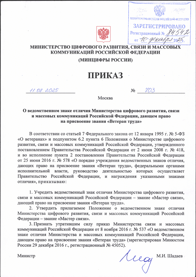 "О ВЕДОМСТВЕННОМ ЗНАКЕ ОТЛИЧИЯ МИНИСТЕРСТВА ЦИФРОВОГО РАЗВИТИЯ, СВЯЗИ И МАССОВЫХ КОММУНИКАЦИЙ РОССИЙСКОЙ ФЕДЕРАЦИИ, ДАЮЩЕМ ПРАВО НА ПРИСВОЕНИЕ ЗВАНИЯ "ВЕТЕРАН ТРУДА"