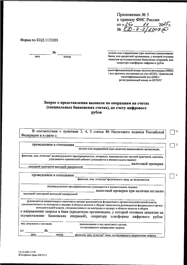 "ОБ УТВЕРЖДЕНИИ ФОРМ И ФОРМАТОВ НАПРАВЛЕНИЯ НАЛОГОВЫМ ОРГАНОМ ЗАПРОСОВ В БАНК (ОПЕРАТОРУ ПО ПЕРЕВОДУ ДЕНЕЖНЫХ СРЕДСТВ), ОПЕРАТОРУ ПЛАТФОРМЫ ЦИФРОВОГО РУБЛЯ В ЭЛЕКТРОННОЙ ФОРМЕ"