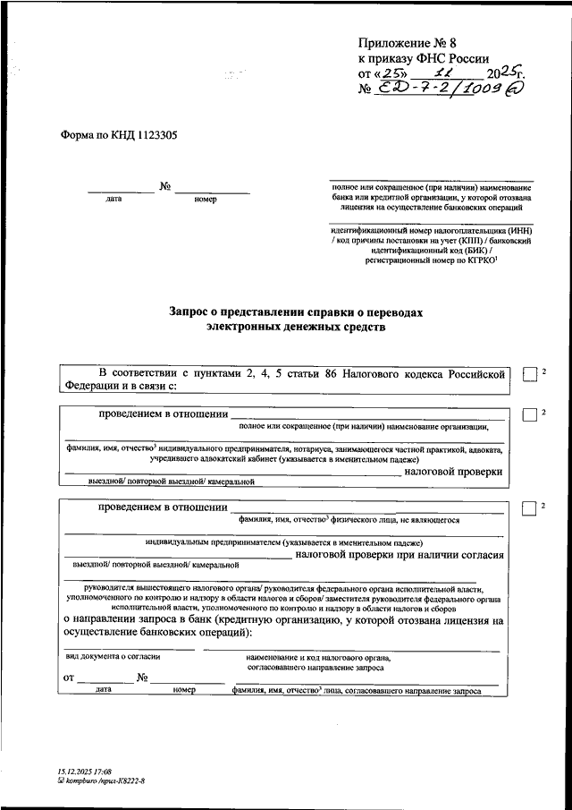 "ОБ УТВЕРЖДЕНИИ ФОРМ И ФОРМАТОВ НАПРАВЛЕНИЯ НАЛОГОВЫМ ОРГАНОМ ЗАПРОСОВ В БАНК (ОПЕРАТОРУ ПО ПЕРЕВОДУ ДЕНЕЖНЫХ СРЕДСТВ), ОПЕРАТОРУ ПЛАТФОРМЫ ЦИФРОВОГО РУБЛЯ В ЭЛЕКТРОННОЙ ФОРМЕ"