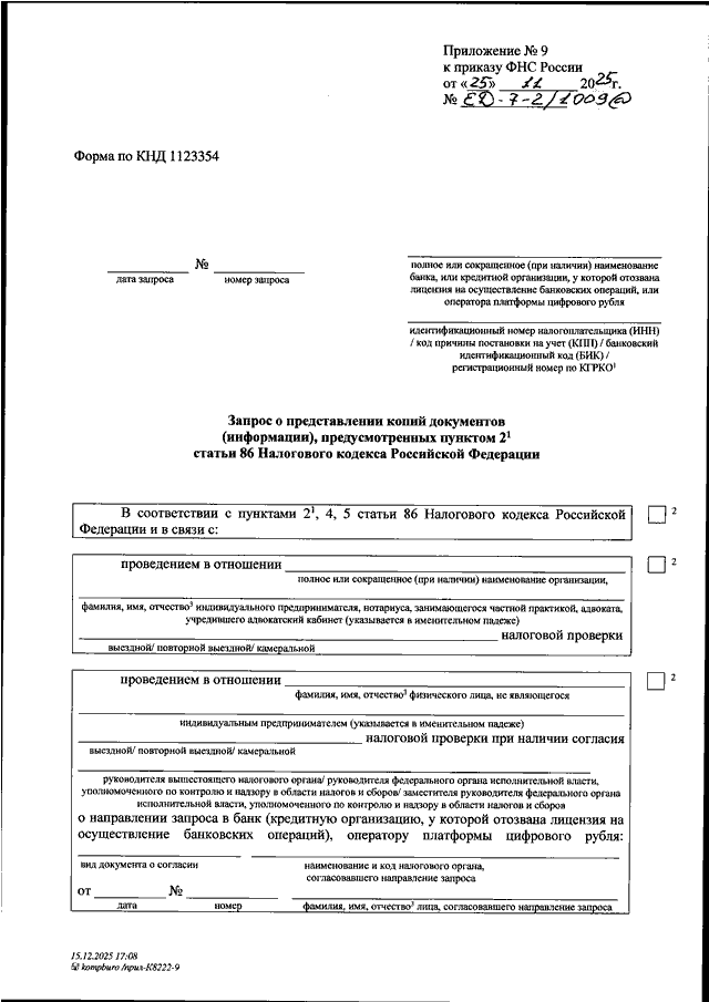 "ОБ УТВЕРЖДЕНИИ ФОРМ И ФОРМАТОВ НАПРАВЛЕНИЯ НАЛОГОВЫМ ОРГАНОМ ЗАПРОСОВ В БАНК (ОПЕРАТОРУ ПО ПЕРЕВОДУ ДЕНЕЖНЫХ СРЕДСТВ), ОПЕРАТОРУ ПЛАТФОРМЫ ЦИФРОВОГО РУБЛЯ В ЭЛЕКТРОННОЙ ФОРМЕ"