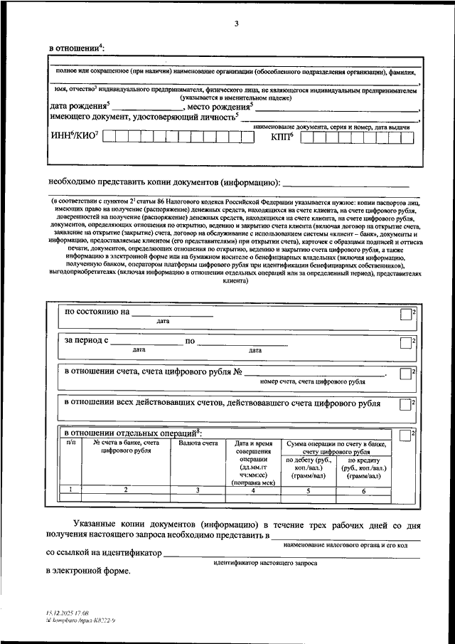 "ОБ УТВЕРЖДЕНИИ ФОРМ И ФОРМАТОВ НАПРАВЛЕНИЯ НАЛОГОВЫМ ОРГАНОМ ЗАПРОСОВ В БАНК (ОПЕРАТОРУ ПО ПЕРЕВОДУ ДЕНЕЖНЫХ СРЕДСТВ), ОПЕРАТОРУ ПЛАТФОРМЫ ЦИФРОВОГО РУБЛЯ В ЭЛЕКТРОННОЙ ФОРМЕ"