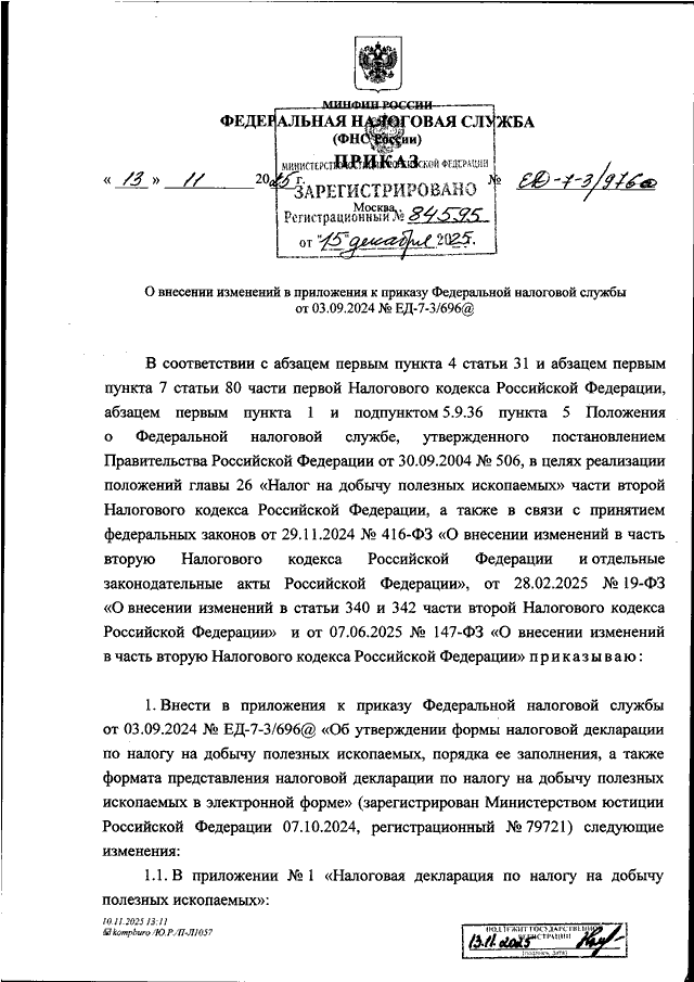 ПРИКАЗ ФНС РФ от 13.11.2025 N ЕД-7-3/976@
