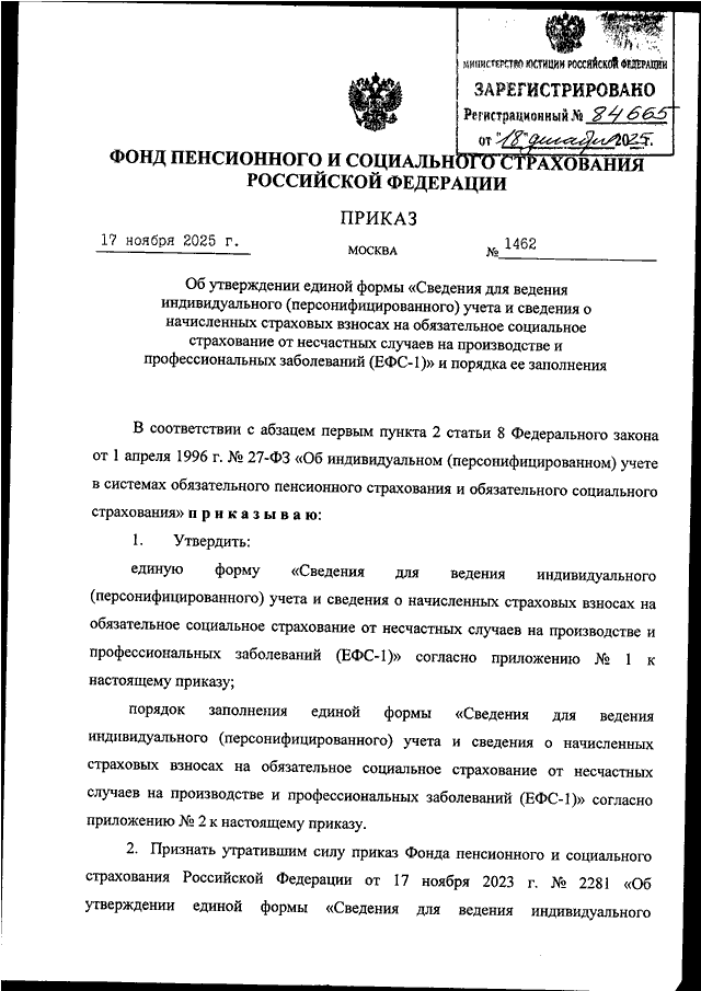 ПРИКАЗ СФР от 17.11.2025 N 1462