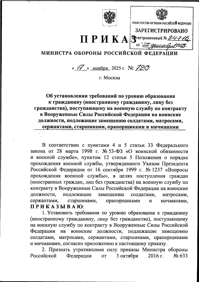 ПРИКАЗ Минобороны РФ от 17.11.2025 N 720