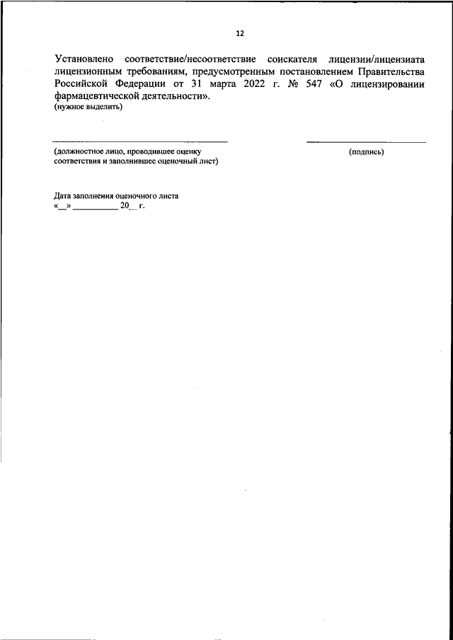 "ОБ УТВЕРЖДЕНИИ ФОРМ ОЦЕНОЧНЫХ ЛИСТОВ, В СООТВЕТСТВИИ С КОТОРЫМИ ФЕДЕРАЛЬНОЙ СЛУЖБОЙ ПО НАДЗОРУ В СФЕРЕ ЗДРАВООХРАНЕНИЯ И ЕЕ ТЕРРИТОРИАЛЬНЫМИ ОРГАНАМИ ПРОВОДИТСЯ ОЦЕНКА СООТВЕТСТВИЯ СОИСКАТЕЛЯ ЛИЦЕНЗИИ ИЛИ ЛИЦЕНЗИАТА ЛИЦЕНЗИОННЫМ ТРЕБОВАНИЯМ ПРИ ОСУЩЕСТВЛЕНИИ ФАРМАЦЕВТИЧЕСКОЙ ДЕЯТЕЛЬНОСТИ"