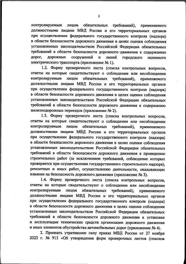 "ОБ УТВЕРЖДЕНИИ ФОРМ ПРОВЕРОЧНЫХ ЛИСТОВ (СПИСКОВ КОНТРОЛЬНЫХ ВОПРОСОВ, ОТВЕТЫ НА КОТОРЫЕ СВИДЕТЕЛЬСТВУЮТ О СОБЛЮДЕНИИ ИЛИ НЕСОБЛЮДЕНИИ КОНТРОЛИРУЕМЫМ ЛИЦОМ ОБЯЗАТЕЛЬНЫХ ТРЕБОВАНИЙ), ПРИМЕНЯЕМЫХ ДОЛЖНОСТНЫМИ ЛИЦАМИ МВД РОССИИ И ЕГО ТЕРРИТОРИАЛЬНЫХ ОРГАНОВ ПРИ ОСУЩЕСТВЛЕНИИ ФЕДЕРАЛЬНОГО ГОСУДАРСТВЕННОГО КОНТРОЛЯ (НАДЗОРА) В ОБЛАСТИ БЕЗОПАСНОСТИ ДОРОЖНОГО ДВИЖЕНИЯ"