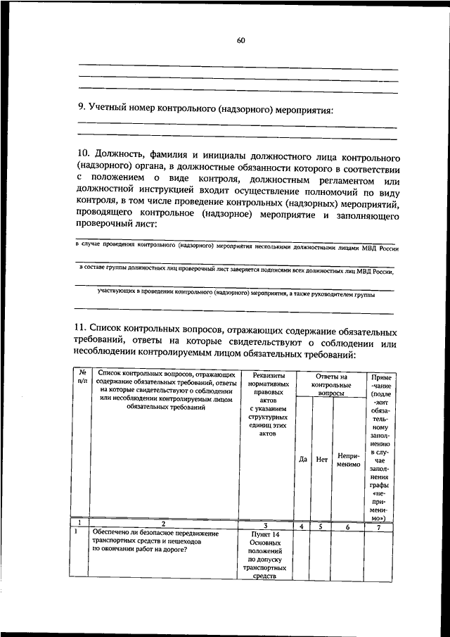 "ОБ УТВЕРЖДЕНИИ ФОРМ ПРОВЕРОЧНЫХ ЛИСТОВ (СПИСКОВ КОНТРОЛЬНЫХ ВОПРОСОВ, ОТВЕТЫ НА КОТОРЫЕ СВИДЕТЕЛЬСТВУЮТ О СОБЛЮДЕНИИ ИЛИ НЕСОБЛЮДЕНИИ КОНТРОЛИРУЕМЫМ ЛИЦОМ ОБЯЗАТЕЛЬНЫХ ТРЕБОВАНИЙ), ПРИМЕНЯЕМЫХ ДОЛЖНОСТНЫМИ ЛИЦАМИ МВД РОССИИ И ЕГО ТЕРРИТОРИАЛЬНЫХ ОРГАНОВ ПРИ ОСУЩЕСТВЛЕНИИ ФЕДЕРАЛЬНОГО ГОСУДАРСТВЕННОГО КОНТРОЛЯ (НАДЗОРА) В ОБЛАСТИ БЕЗОПАСНОСТИ ДОРОЖНОГО ДВИЖЕНИЯ"