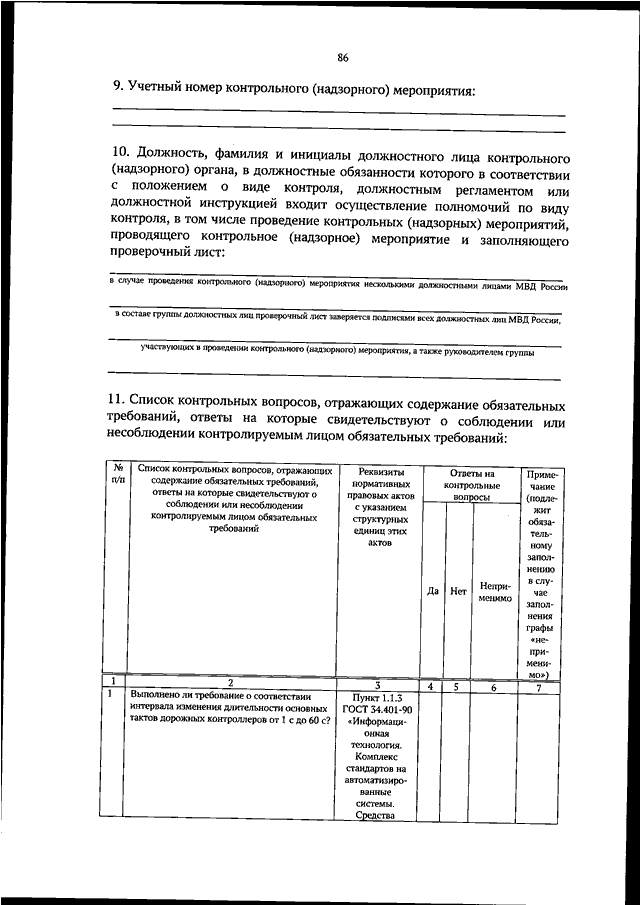 "ОБ УТВЕРЖДЕНИИ ФОРМ ПРОВЕРОЧНЫХ ЛИСТОВ (СПИСКОВ КОНТРОЛЬНЫХ ВОПРОСОВ, ОТВЕТЫ НА КОТОРЫЕ СВИДЕТЕЛЬСТВУЮТ О СОБЛЮДЕНИИ ИЛИ НЕСОБЛЮДЕНИИ КОНТРОЛИРУЕМЫМ ЛИЦОМ ОБЯЗАТЕЛЬНЫХ ТРЕБОВАНИЙ), ПРИМЕНЯЕМЫХ ДОЛЖНОСТНЫМИ ЛИЦАМИ МВД РОССИИ И ЕГО ТЕРРИТОРИАЛЬНЫХ ОРГАНОВ ПРИ ОСУЩЕСТВЛЕНИИ ФЕДЕРАЛЬНОГО ГОСУДАРСТВЕННОГО КОНТРОЛЯ (НАДЗОРА) В ОБЛАСТИ БЕЗОПАСНОСТИ ДОРОЖНОГО ДВИЖЕНИЯ"