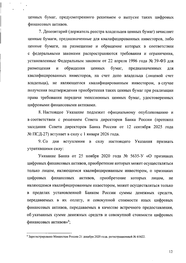 "ОБ ОПРЕДЕЛЕНИИ ПРИЗНАКОВ ЦИФРОВЫХ ФИНАНСОВЫХ АКТИВОВ, УСТАНОВЛЕНИИ СУММЫ ДЕНЕЖНЫХ СРЕДСТВ, ПЕРЕДАВАЕМЫХ В ИХ ОПЛАТУ, И (ИЛИ) СОВОКУПНОЙ СТОИМОСТИ ИНЫХ ЦИФРОВЫХ ФИНАНСОВЫХ АКТИВОВ, ПЕРЕДАВАЕМЫХ В КАЧЕСТВЕ ВСТРЕЧНОГО ПРЕДОСТАВЛЕНИЯ, В ЦЕЛЯХ ПРИМЕНЕНИЯ ЧАСТИ 9 СТАТЬИ 4 ФЕДЕРАЛЬНОГО ЗАКОНА ОТ 31 ИЮЛЯ 2020 Г. N 259-ФЗ "О ЦИФРОВЫХ ФИНАНСОВЫХ АКТИВАХ, ЦИФРОВОЙ ВАЛЮТЕ И О ВНЕСЕНИИ ИЗМЕНЕНИЙ В ОТДЕЛЬНЫЕ ЗАКОНОДАТЕЛЬНЫЕ АКТЫ РОССИЙСКОЙ ФЕДЕРАЦИИ", ОБ УСТАНОВЛЕНИИ СЛУЧАЕВ ЗАЧИСЛЕНИЯ ЦЕННЫХ БУМАГ В ЦЕЛЯХ ПРИМЕНЕНИЯ ПУНКТА 13 СТАТЬИ 7, АБЗАЦА ДВЕНАДЦАТОГО ПУНКТА 1 СТАТЬИ 8, А ТАКЖЕ ОБ УСТАНОВЛЕНИИ СЛУЧАЕВ ПРИОБРЕТЕНИЯ И ОТЧУЖДЕНИЯ ЦЕННЫХ БУМАГ В ЦЕЛЯХ ПРИМЕНЕНИЯ ПУНКТА 3 СТАТЬИ 27.6 ФЕДЕРАЛЬНОГО ЗАКОНА ОТ 22 АПРЕЛЯ 1996 Г. N 39-ФЗ "О РЫНКЕ ЦЕННЫХ БУМАГ"