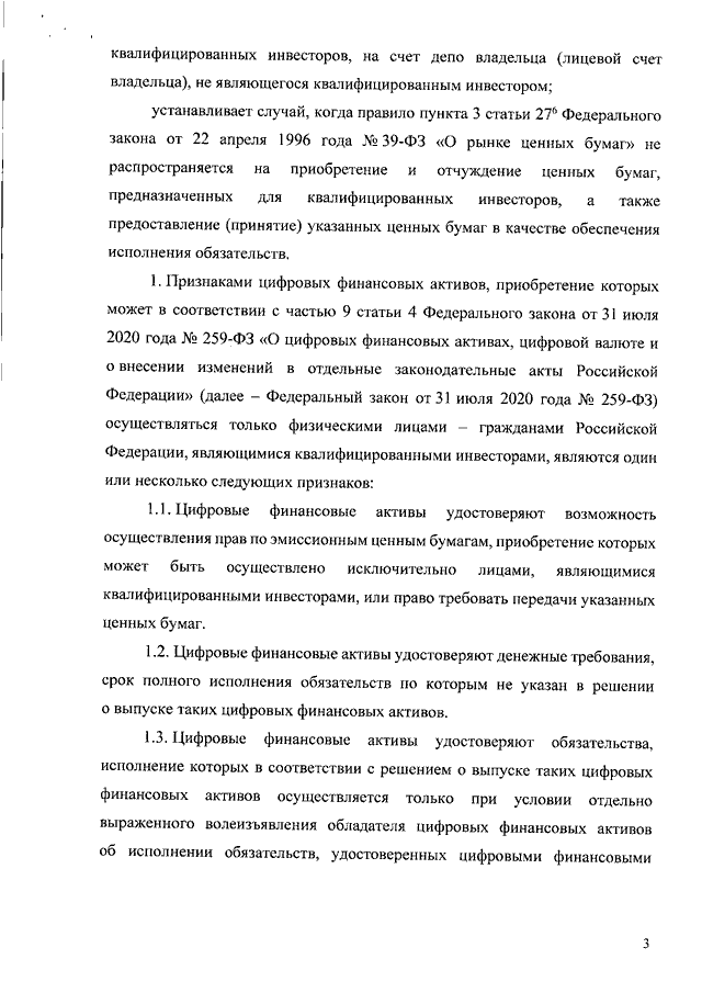 "ОБ ОПРЕДЕЛЕНИИ ПРИЗНАКОВ ЦИФРОВЫХ ФИНАНСОВЫХ АКТИВОВ, УСТАНОВЛЕНИИ СУММЫ ДЕНЕЖНЫХ СРЕДСТВ, ПЕРЕДАВАЕМЫХ В ИХ ОПЛАТУ, И (ИЛИ) СОВОКУПНОЙ СТОИМОСТИ ИНЫХ ЦИФРОВЫХ ФИНАНСОВЫХ АКТИВОВ, ПЕРЕДАВАЕМЫХ В КАЧЕСТВЕ ВСТРЕЧНОГО ПРЕДОСТАВЛЕНИЯ, В ЦЕЛЯХ ПРИМЕНЕНИЯ ЧАСТИ 9 СТАТЬИ 4 ФЕДЕРАЛЬНОГО ЗАКОНА ОТ 31 ИЮЛЯ 2020 Г. N 259-ФЗ "О ЦИФРОВЫХ ФИНАНСОВЫХ АКТИВАХ, ЦИФРОВОЙ ВАЛЮТЕ И О ВНЕСЕНИИ ИЗМЕНЕНИЙ В ОТДЕЛЬНЫЕ ЗАКОНОДАТЕЛЬНЫЕ АКТЫ РОССИЙСКОЙ ФЕДЕРАЦИИ", ОБ УСТАНОВЛЕНИИ СЛУЧАЕВ ЗАЧИСЛЕНИЯ ЦЕННЫХ БУМАГ В ЦЕЛЯХ ПРИМЕНЕНИЯ ПУНКТА 13 СТАТЬИ 7, АБЗАЦА ДВЕНАДЦАТОГО ПУНКТА 1 СТАТЬИ 8, А ТАКЖЕ ОБ УСТАНОВЛЕНИИ СЛУЧАЕВ ПРИОБРЕТЕНИЯ И ОТЧУЖДЕНИЯ ЦЕННЫХ БУМАГ В ЦЕЛЯХ ПРИМЕНЕНИЯ ПУНКТА 3 СТАТЬИ 27.6 ФЕДЕРАЛЬНОГО ЗАКОНА ОТ 22 АПРЕЛЯ 1996 Г. N 39-ФЗ "О РЫНКЕ ЦЕННЫХ БУМАГ"