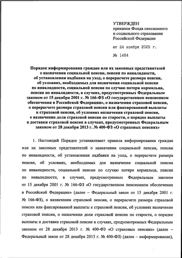 "ОБ УТВЕРЖДЕНИИ ПОРЯДКА ИНФОРМИРОВАНИЯ ГРАЖДАН ИЛИ ИХ ЗАКОННЫХ ПРЕДСТАВИТЕЛЕЙ О НАЗНАЧЕНИИ СОЦИАЛЬНОЙ ПЕНСИИ, ПЕНСИИ ПО ИНВАЛИДНОСТИ, ОБ УСТАНОВЛЕНИИ НАДБАВКИ НА УХОД, О ПЕРЕРАСЧЕТЕ РАЗМЕРА ПЕНСИИ, ОБ УСЛОВИЯХ, НЕОБХОДИМЫХ ДЛЯ НАЗНАЧЕНИЯ СОЦИАЛЬНОЙ ПЕНСИИ ПО ИНВАЛИДНОСТИ, СОЦИАЛЬНОЙ ПЕНСИИ ПО СЛУЧАЮ ПОТЕРИ КОРМИЛЬЦА, ПЕНСИИ ПО ИНВАЛИДНОСТИ, В СЛУЧАЯХ, ПРЕДУСМОТРЕННЫХ ФЕДЕРАЛЬНЫМ ЗАКОНОМ ОТ 15 ДЕКАБРЯ 2001 Г. N 166-ФЗ "О ГОСУДАРСТВЕННОМ ПЕНСИОННОМ ОБЕСПЕЧЕНИИ В РОССИЙСКОЙ ФЕДЕРАЦИИ", О НАЗНАЧЕНИИ СТРАХОВОЙ ПЕНСИИ, О ПЕРЕРАСЧЕТЕ РАЗМЕРА СТРАХОВОЙ ПЕНСИИ ИЛИ ФИКСИРОВАННОЙ ВЫПЛАТЫ К СТРАХОВОЙ ПЕНСИИ, ОБ УСЛОВИЯХ НАЗНАЧЕНИЯ СТРАХОВОЙ ПЕНСИИ, О НАЗНАЧЕНИИ ДОЛИ СТРАХОВОЙ ПЕНСИИ ПО СТАРОСТИ, О ПОРЯДКЕ ВЫПЛАТЫ И ДОСТАВКИ СТРАХОВОЙ ПЕНСИИ В СЛУЧАЯХ, ПРЕДУСМОТРЕННЫХ ФЕДЕРАЛЬНЫМ ЗАКОНОМ ОТ 28 ДЕКАБРЯ 2013 Г. N 400-ФЗ "О СТРАХОВЫХ ПЕНСИЯХ"