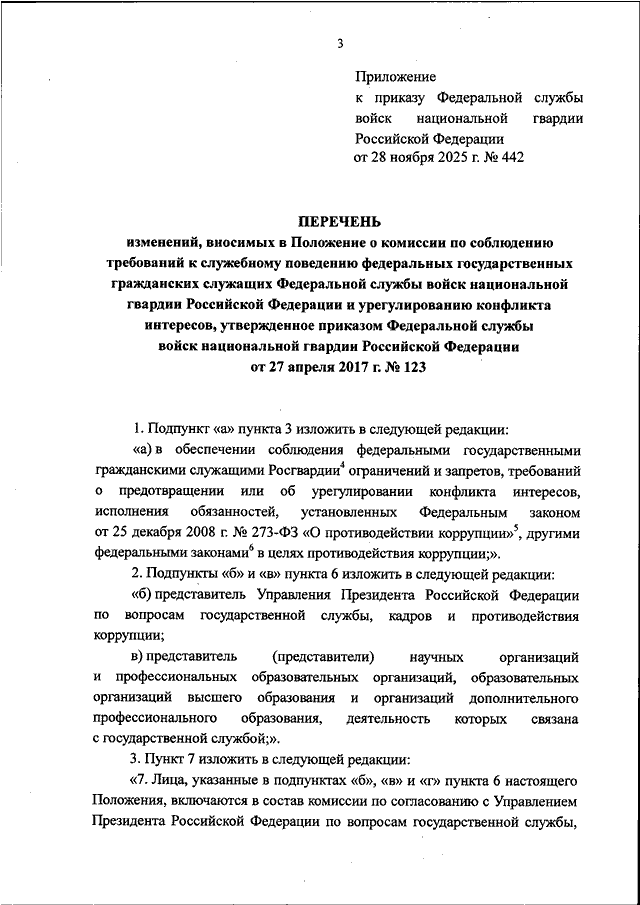 "О ВНЕСЕНИИ ИЗМЕНЕНИЙ В ПОЛОЖЕНИЕ О КОМИССИИ ПО СОБЛЮДЕНИЮ ТРЕБОВАНИЙ К СЛУЖЕБНОМУ ПОВЕДЕНИЮ ФЕДЕРАЛЬНЫХ ГОСУДАРСТВЕННЫХ ГРАЖДАНСКИХ СЛУЖАЩИХ ФЕДЕРАЛЬНОЙ СЛУЖБЫ ВОЙСК НАЦИОНАЛЬНОЙ ГВАРДИИ РОССИЙСКОЙ ФЕДЕРАЦИИ И УРЕГУЛИРОВАНИЮ КОНФЛИКТА ИНТЕРЕСОВ, УТВЕРЖДЕННОЕ ПРИКАЗОМ ФЕДЕРАЛЬНОЙ СЛУЖБЫ ВОЙСК НАЦИОНАЛЬНОЙ ГВАРДИИ РОССИЙСКОЙ ФЕДЕРАЦИИ ОТ 27 АПРЕЛЯ 2017 Г. N 123"