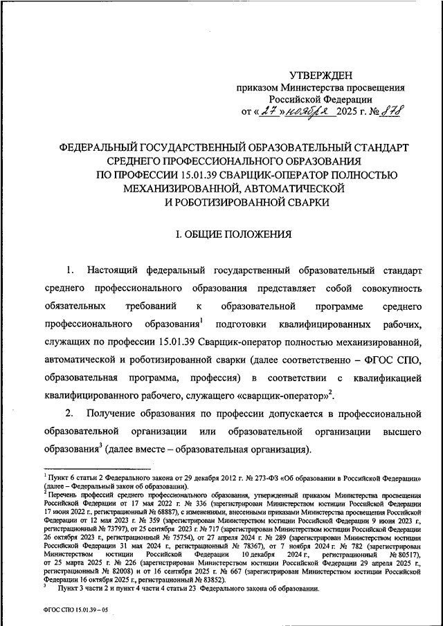 "ОБ УТВЕРЖДЕНИИ ФЕДЕРАЛЬНОГО ГОСУДАРСТВЕННОГО ОБРАЗОВАТЕЛЬНОГО СТАНДАРТА СРЕДНЕГО ПРОФЕССИОНАЛЬНОГО ОБРАЗОВАНИЯ ПО ПРОФЕССИИ 15.01.39 СВАРЩИК - ОПЕРАТОР ПОЛНОСТЬЮ МЕХАНИЗИРОВАННОЙ, АВТОМАТИЧЕСКОЙ И РОБОТИЗИРОВАННОЙ СВАРКИ"