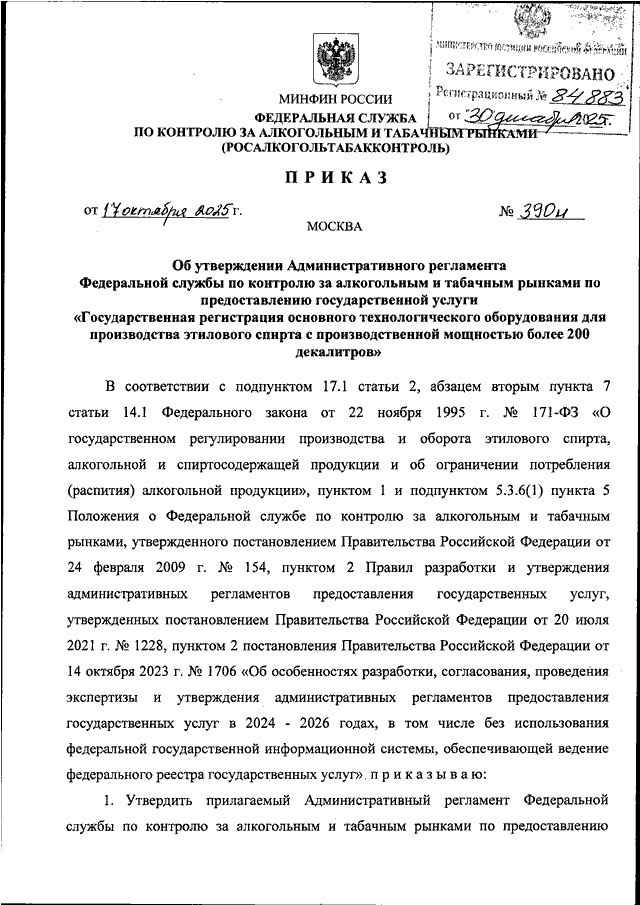 ПРИКАЗ Росалкогольтабакконтроля от 17.10.2025 N 390н