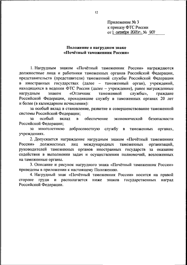 ПРИКАЗ ФТС РФ от 01.10.2025 N 907