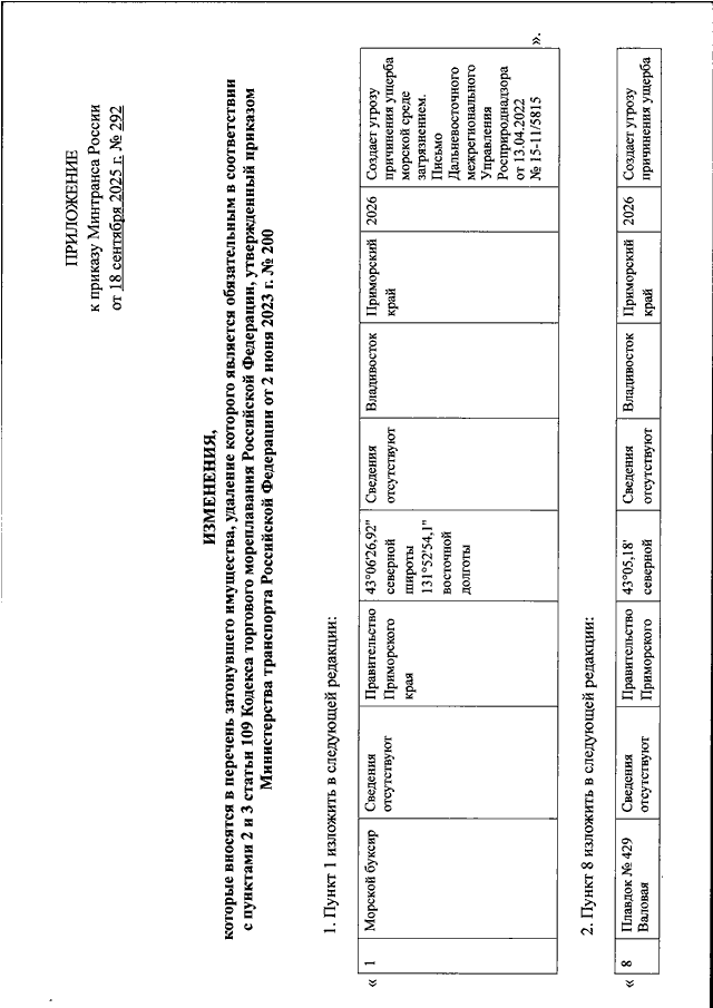 "О ВНЕСЕНИИ ИЗМЕНЕНИЙ В ПЕРЕЧЕНЬ ЗАТОНУВШЕГО ИМУЩЕСТВА, УДАЛЕНИЕ КОТОРОГО ЯВЛЯЕТСЯ ОБЯЗАТЕЛЬНЫМ В СООТВЕТСТВИИ С ПУНКТАМИ 2 И 3 СТАТЬИ 109 КОДЕКСА ТОРГОВОГО МОРЕПЛАВАНИЯ РОССИЙСКОЙ ФЕДЕРАЦИИ, УТВЕРЖДЕННЫЙ ПРИКАЗОМ МИНИСТЕРСТВА ТРАНСПОРТА РОССИЙСКОЙ ФЕДЕРАЦИИ ОТ 2 ИЮНЯ 2023 Г. N 200"