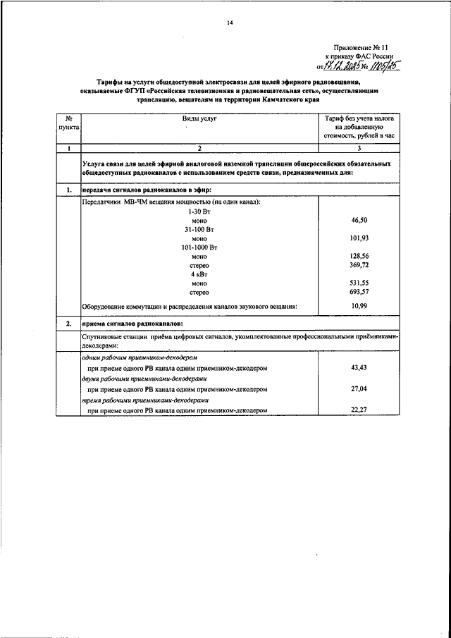 "ОБ УТВЕРЖДЕНИИ ТАРИФОВ НА УСЛУГИ ОБЩЕДОСТУПНОЙ ЭЛЕКТРОСВЯЗИ ДЛЯ ЦЕЛЕЙ ЭФИРНОГО ТЕЛЕВИЗИОННОГО ВЕЩАНИЯ И (ИЛИ) РАДИОВЕЩАНИЯ, ОКАЗЫВАЕМЫЕ ФГУП "РОССИЙСКАЯ ТЕЛЕВИЗИОННАЯ И РАДИОВЕЩАТЕЛЬНАЯ СЕТЬ", ОСУЩЕСТВЛЯЮЩИМ ТРАНСЛЯЦИЮ, ВЕЩАТЕЛЯМ"