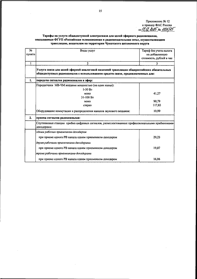 "ОБ УТВЕРЖДЕНИИ ТАРИФОВ НА УСЛУГИ ОБЩЕДОСТУПНОЙ ЭЛЕКТРОСВЯЗИ ДЛЯ ЦЕЛЕЙ ЭФИРНОГО ТЕЛЕВИЗИОННОГО ВЕЩАНИЯ И (ИЛИ) РАДИОВЕЩАНИЯ, ОКАЗЫВАЕМЫЕ ФГУП "РОССИЙСКАЯ ТЕЛЕВИЗИОННАЯ И РАДИОВЕЩАТЕЛЬНАЯ СЕТЬ", ОСУЩЕСТВЛЯЮЩИМ ТРАНСЛЯЦИЮ, ВЕЩАТЕЛЯМ"
