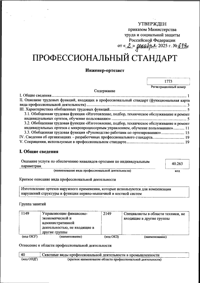 "ОБ УТВЕРЖДЕНИИ ПРОФЕССИОНАЛЬНОГО СТАНДАРТА "ИНЖЕНЕР-ОРТЕЗИСТ"