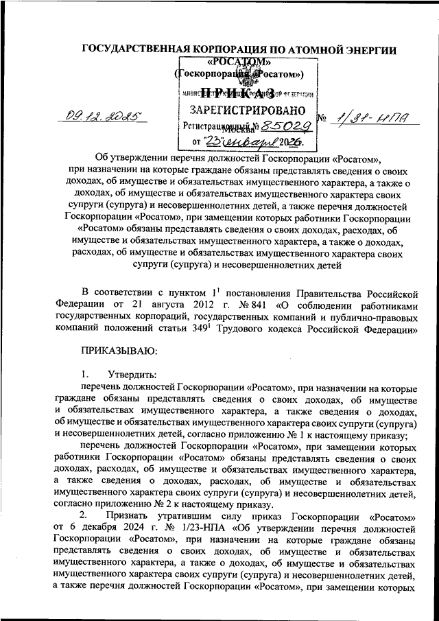 "Росатом" от 09.12.2025 N 1/31-НПА "ОБ УТВЕРЖДЕНИИ ПЕРЕЧНЯ ДОЛЖНОСТЕЙ ГОСКОРПОРАЦИИ "РОСАТОМ", ПРИ НАЗНАЧЕНИИ НА КОТОРЫЕ ГРАЖДАНЕ ОБЯЗАНЫ ПРЕДСТАВЛЯТЬ СВЕДЕНИЯ О СВОИХ ДОХОДАХ, ОБ ИМУЩЕСТВЕ И ОБЯЗАТЕЛЬСТВАХ ИМУЩЕСТВЕННОГО ХАРАКТЕРА, А ТАКЖЕ О ДОХОДАХ, ОБ ИМУЩЕСТВЕ И ОБЯЗАТЕЛЬСТВАХ ИМУЩЕСТВЕННОГО ХАРАКТЕРА СВОИХ СУПРУГИ (СУПРУГА) И НЕСОВЕРШЕННОЛЕТНИХ ДЕТЕЙ, А ТАКЖЕ ПЕРЕЧНЯ ДОЛЖНОСТЕЙ ГОСКОРПОРАЦИИ "РОСАТОМ", ПРИ ЗАМЕЩЕНИИ КОТОРЫХ РАБОТНИКИ ГОСКОРПОРАЦИИ "РОСАТОМ" ОБЯЗАНЫ ПРЕДСТАВЛЯТЬ СВЕДЕНИЯ О СВОИХ ДОХОДАХ, РАСХОДАХ, ОБ ИМУЩЕСТВЕ И ОБЯЗАТЕЛЬСТВАХ ИМУЩЕСТВЕННОГО ХАРАКТЕРА, А ТАКЖЕ О ДОХОДАХ, РАСХОДАХ, ОБ ИМУЩЕСТВЕ И ОБЯЗАТЕЛЬСТВАХ ИМУЩЕСТВЕННОГО ХАРАКТЕРА СВОИХ СУПРУГИ (СУПРУГА) И НЕСОВЕРШЕННОЛЕТНИХ ДЕТЕЙ"