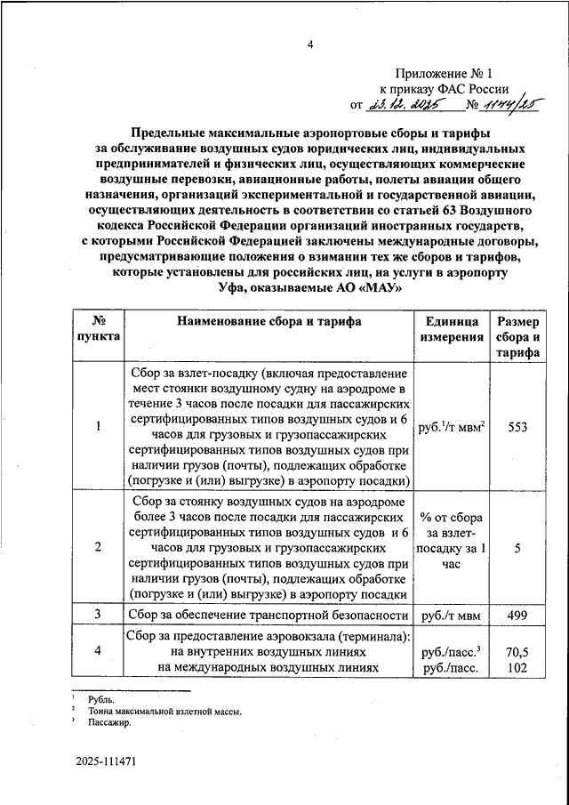 "ОБ УТВЕРЖДЕНИИ ПРЕДЕЛЬНЫХ МАКСИМАЛЬНЫХ АЭРОПОРТОВЫХ СБОРОВ И ТАРИФОВ ЗА ОБСЛУЖИВАНИЕ ВОЗДУШНЫХ СУДОВ ЮРИДИЧЕСКИХ ЛИЦ, ИНДИВИДУАЛЬНЫХ ПРЕДПРИНИМАТЕЛЕЙ И ФИЗИЧЕСКИХ ЛИЦ, ОСУЩЕСТВЛЯЮЩИХ КОММЕРЧЕСКИЕ ВОЗДУШНЫЕ ПЕРЕВОЗКИ, АВИАЦИОННЫЕ РАБОТЫ, ПОЛЕТЫ АВИАЦИИ ОБЩЕГО НАЗНАЧЕНИЯ, ОРГАНИЗАЦИЙ ЭКСПЕРИМЕНТАЛЬНОЙ И ГОСУДАРСТВЕННОЙ АВИАЦИИ, ОСУЩЕСТВЛЯЮЩИХ ДЕЯТЕЛЬНОСТЬ В СООТВЕТСТВИИ СО СТАТЬЕЙ 63 ВОЗДУШНОГО КОДЕКСА РОССИЙСКОЙ ФЕДЕРАЦИИ ОРГАНИЗАЦИЙ ИНОСТРАННЫХ ГОСУДАРСТВ, С КОТОРЫМИ РОССИЙСКОЙ ФЕДЕРАЦИЕЙ ЗАКЛЮЧЕНЫ МЕЖДУНАРОДНЫЕ ДОГОВОРЫ, ПРЕДУСМАТРИВАЮЩИЕ ПОЛОЖЕНИЯ О ВЗИМАНИИ ТЕХ ЖЕ СБОРОВ И ТАРИФОВ, КОТОРЫЕ УСТАНОВЛЕНЫ ДЛЯ РОССИЙСКИХ ЛИЦ, И ПРЕДЕЛЬНЫХ МАКСИМАЛЬНЫХ АЭРОПОРТОВЫХ СБОРОВ ЗА ОБСЛУЖИВАНИЕ ВОЗДУШНЫХ СУДОВ ОСУЩЕСТВЛЯЮЩИХ ДЕЯТЕЛЬНОСТЬ В СООТВЕТСТВИИ СО СТАТЬЕЙ 63 ВОЗДУШНОГО КОДЕКСА РОССИЙСКОЙ ФЕДЕРАЦИИ ОРГАНИЗАЦИЙ ИНОСТРАННЫХ ГОСУДАРСТВ, С КОТОРЫМИ У РОССИЙСКОЙ ФЕДЕРАЦИИ ОТСУТСТВУЮТ ЗАКЛЮЧЕННЫЕ МЕЖДУНАРОДНЫЕ ДОГОВОРЫ, ПРЕДУСМАТРИВАЮЩИЕ ПОЛОЖЕНИЯ О ВЗИМАНИИ ТЕХ ЖЕ СБОРОВ, КОТОРЫЕ УСТАНОВЛЕНЫ ДЛЯ РОССИЙСКИХ ЛИЦ, НА УСЛУГИ В АЭРОПОРТУ УФА, ОКАЗЫВАЕМЫЕ АО "МАУ"