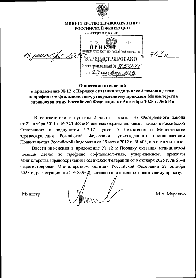 "О ВНЕСЕНИИ ИЗМЕНЕНИЙ В ПРИЛОЖЕНИЕ N 12 К ПОРЯДКУ ОКАЗАНИЯ МЕДИЦИНСКОЙ ПОМОЩИ ДЕТЯМ ПО ПРОФИЛЮ "ОФТАЛЬМОЛОГИЯ", УТВЕРЖДЕННОМУ ПРИКАЗОМ МИНИСТЕРСТВА ЗДРАВООХРАНЕНИЯ РОССИЙСКОЙ ФЕДЕРАЦИИ ОТ 9 ОКТЯБРЯ 2025 Г. N 614Н"