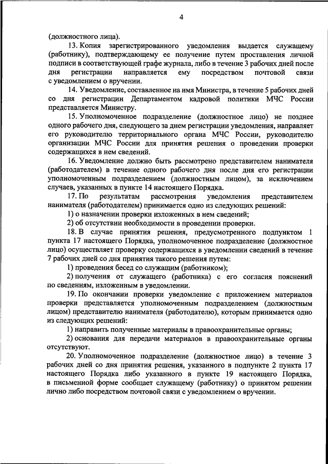 "ОБ ОПРЕДЕЛЕНИИ ПОРЯДКА УВЕДОМЛЕНИИ ПРЕДСТАВИТЕЛЯ НАНИМАТЕЛЯ (РАБОТОДАТЕЛЯ) ВОЕННОСЛУЖАЩИМИ СПАСАТЕЛЬНЫХ ВОИНСКИХ ФОРМИРОВАНИЙ МЧС РОССИИ, СОТРУДНИКАМИ ФЕДЕРАЛЬНОЙ ПРОТИВОПОЖАРНОЙ СЛУЖБЫ ГОСУДАРСТВЕННОЙ ПРОТИВОПОЖАРНОЙ СЛУЖБЫ, ФЕДЕРАЛЬНЫМИ ГОСУДАРСТВЕННЫМИ ГРАЖДАНСКИМИ СЛУЖАЩИМИ МЧС РОССИИ И ЕГО ТЕРРИТОРИАЛЬНЫХ ОРГАНОВ, РАБОТНИКАМИ, ЗАМЕЩАЮЩИМИ ОТДЕЛЬНЫЕ ДОЛЖНОСТИ НА ОСНОВАНИИ ТРУДОВОГО ДОГОВОРА В ОРГАНИЗАЦИЯХ, СОЗДАННЫХ ДЛЯ ВЫПОЛНЕНИЯ ЗАДАЧ, ПОСТАВЛЕННЫХ ПЕРЕД МЧС РОССИИ, О ФАКТАХ ОБРАЩЕНИЯ В ЦЕЛЯХ СКЛОНЕНИЯ К СОВЕРШЕНИЮ КОРРУПЦИОННЫХ ПРАВОНАРУШЕНИЙ, РЕГИСТРАЦИИ ТАКИХ УВЕДОМЛЕНИЙ И ОРГАНИЗАЦИИ ПРОВЕРКИ СОДЕРЖАЩИХСЯ В НИХ СВЕДЕНИЙ"