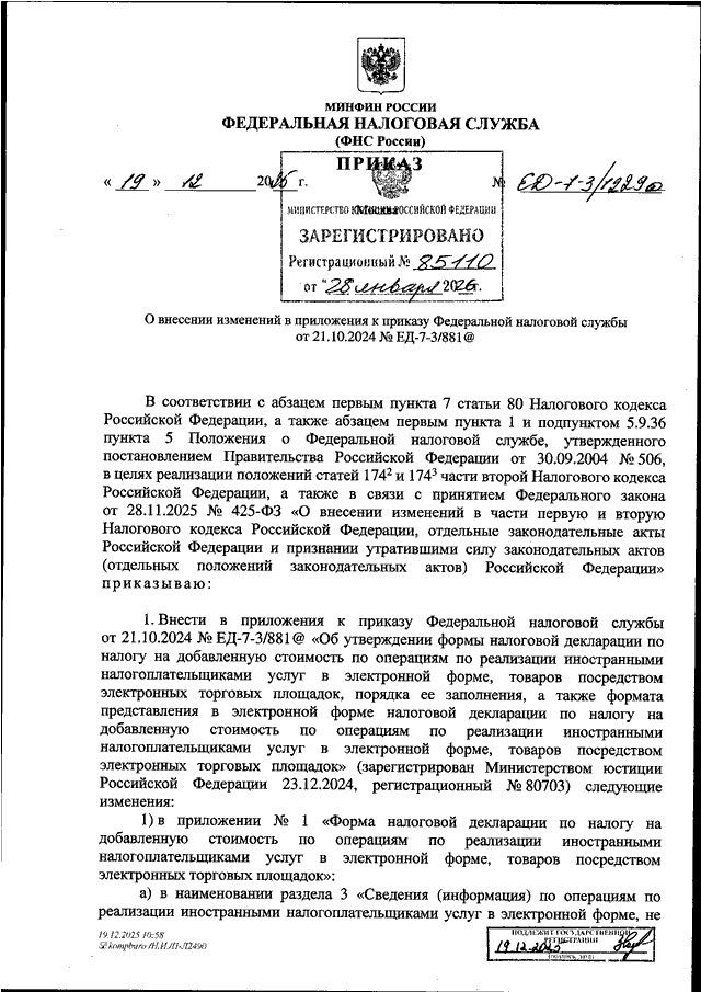 ПРИКАЗ ФНС РФ от 19.12.2025 N ЕД-7-3/1229@