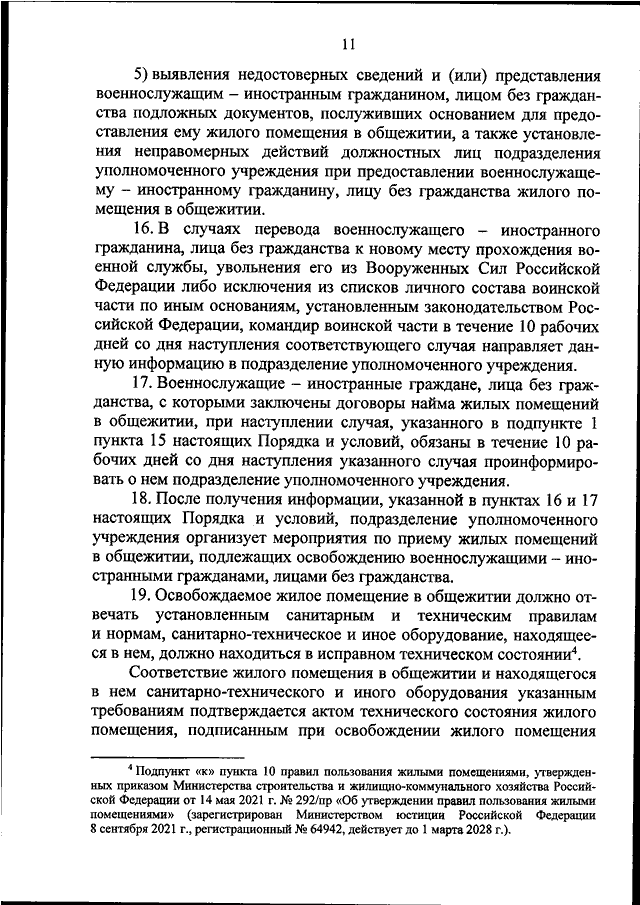 "ОБ ОПРЕДЕЛЕНИИ ПОРЯДКА И УСЛОВИЙ ПРЕДОСТАВЛЕНИЯ ВОЕННОСЛУЖАЩИМ ИЗ ЧИСЛА ИНОСТРАННЫХ ГРАЖДАН И ЛИЦ БЕЗ ГРАЖДАНСТВА, ПРОХОДЯЩИМ ВОЕННУЮ СЛУЖБУ В ВООРУЖЕННЫХ СИЛАХ РОССИЙСКОЙ ФЕДЕРАЦИИ, ЖИЛЫХ ПОМЕЩЕНИЙ В ОБЩЕЖИТИЯХ И ОСВОБОЖДЕНИЯ ИМИ ЭТИХ ПОМЕЩЕНИЙ"