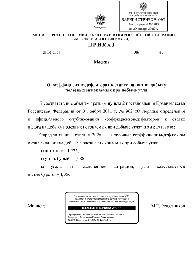 ПРИКАЗ Минэкономразвития РФ от 23.01.2026 N 43