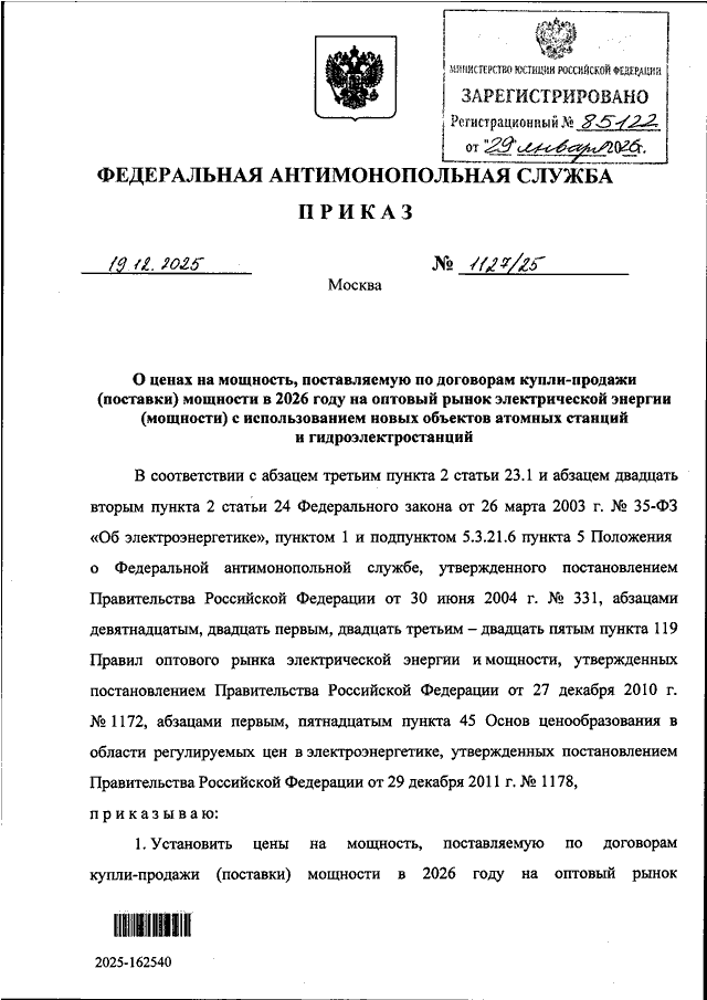 ПРИКАЗ Федеральной антимонопольной службы от 19.12.2025 N 1127/25