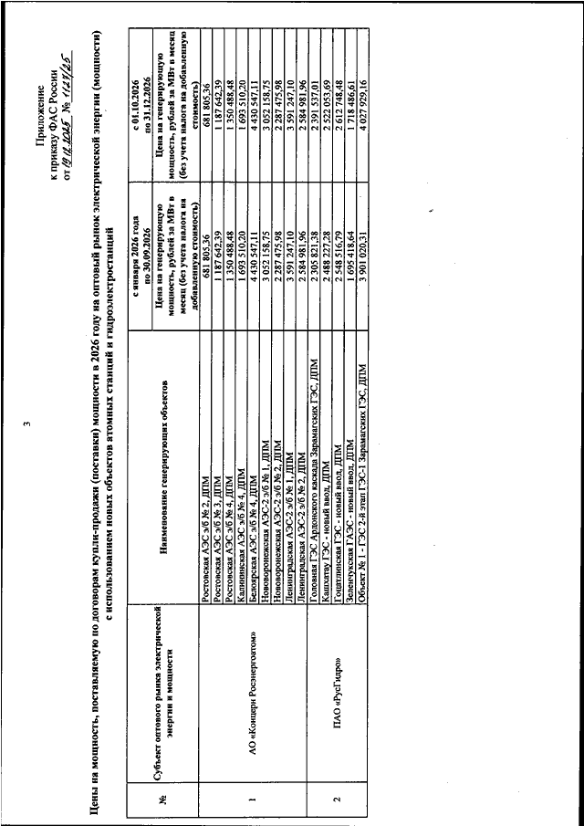"О ЦЕНАХ НА МОЩНОСТЬ, ПОСТАВЛЯЕМУЮ ПО ДОГОВОРАМ КУПЛИ - ПРОДАЖИ (ПОСТАВКИ) МОЩНОСТИ В 2026 ГОДУ НА ОПТОВЫЙ РЫНОК ЭЛЕКТРИЧЕСКОЙ ЭНЕРГИИ (МОЩНОСТИ) С ИСПОЛЬЗОВАНИЕМ НОВЫХ ОБЪЕКТОВ АТОМНЫХ СТАНЦИЙ И ГИДРОЭЛЕКТРОСТАНЦИЙ"