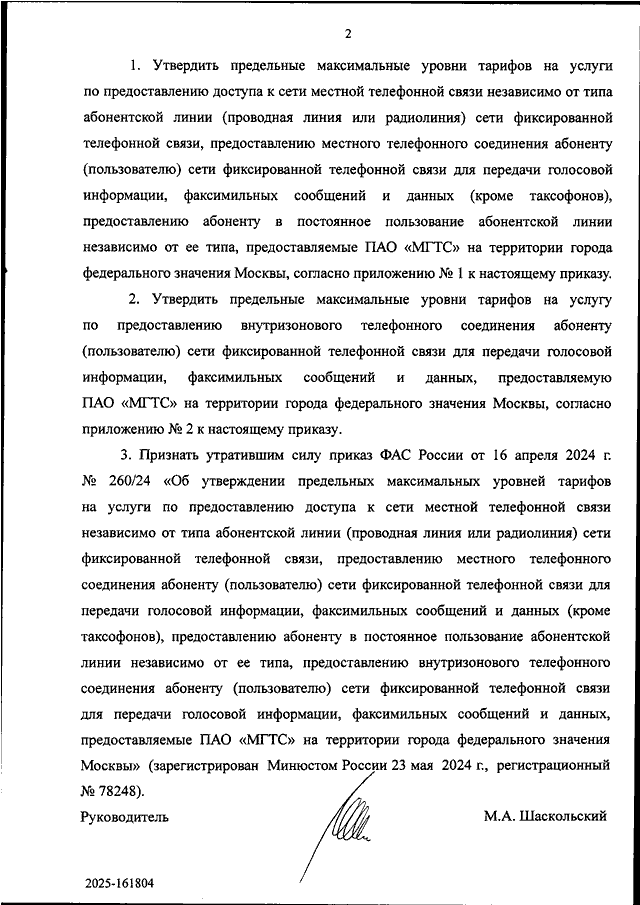 "ОБ УТВЕРЖДЕНИИ ПРЕДЕЛЬНЫХ МАКСИМАЛЬНЫХ УРОВНЕЙ ТАРИФОВ НА УСЛУГИ ПО ПРЕДОСТАВЛЕНИЮ ДОСТУПА К СЕТИ МЕСТНОЙ ТЕЛЕФОННОЙ СВЯЗИ НЕЗАВИСИМО ОТ ТИПА АБОНЕНТСКОЙ ЛИНИИ (ПРОВОДНАЯ ЛИНИЯ ИЛИ РАДИОЛИНИЯ) СЕТИ ФИКСИРОВАННОЙ ТЕЛЕФОННОЙ СВЯЗИ, ПРЕДОСТАВЛЕНИЮ МЕСТНОГО ТЕЛЕФОННОГО СОЕДИНЕНИЯ АБОНЕНТУ (ПОЛЬЗОВАТЕЛЮ) СЕТИ ФИКСИРОВАННОЙ ТЕЛЕФОННОЙ СВЯЗИ ДЛЯ ПЕРЕДАЧИ ГОЛОСОВОЙ ИНФОРМАЦИИ, ФАКСИМИЛЬНЫХ СООБЩЕНИЙ И ДАННЫХ (КРОМЕ ТАКСОФОНОВ), ПРЕДОСТАВЛЕНИЮ АБОНЕНТУ В ПОСТОЯННОЕ ПОЛЬЗОВАНИЕ АБОНЕНТСКОЙ ЛИНИИ НЕЗАВИСИМО ОТ ЕЕ ТИПА, ПРЕДОСТАВЛЕНИЮ ВНУТРИЗОНОВОГО ТЕЛЕФОННОГО СОЕДИНЕНИЯ АБОНЕНТУ (ПОЛЬЗОВАТЕЛЮ) СЕТИ ФИКСИРОВАННОЙ ТЕЛЕФОННОЙ СВЯЗИ ДЛЯ ПЕРЕДАЧИ ГОЛОСОВОЙ ИНФОРМАЦИИ, ФАКСИМИЛЬНЫХ СООБЩЕНИЙ И ДАННЫХ, ПРЕДОСТАВЛЯЕМЫЕ ПАО "МГТС" НА ТЕРРИТОРИИ ГОРОДА ФЕДЕРАЛЬНОГО ЗНАЧЕНИЯ МОСКВЫ"