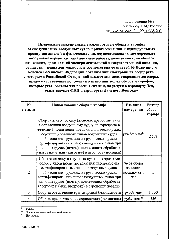 "ОБ УТВЕРЖДЕНИИ ПРЕДЕЛЬНЫХ МАКСИМАЛЬНЫХ АЭРОПОРТОВЫХ СБОРОВ И ТАРИФОВ ЗА ОБСЛУЖИВАНИЕ ВОЗДУШНЫХ СУДОВ ЮРИДИЧЕСКИХ ЛИЦ, ИНДИВИДУАЛЬНЫХ ПРЕДПРИНИМАТЕЛЕЙ И ФИЗИЧЕСКИХ ЛИЦ, ОСУЩЕСТВЛЯЮЩИХ КОММЕРЧЕСКИЕ ВОЗДУШНЫЕ ПЕРЕВОЗКИ, АВИАЦИОННЫЕ РАБОТЫ, ПОЛЕТЫ АВИАЦИИ ОБЩЕГО НАЗНАЧЕНИЯ, ОРГАНИЗАЦИЙ ЭКСПЕРИМЕНТАЛЬНОЙ И ГОСУДАРСТВЕННОЙ АВИАЦИИ, ОСУЩЕСТВЛЯЮЩИХ ДЕЯТЕЛЬНОСТЬ В СООТВЕТСТВИИ СО СТАТЬЕЙ 63 ВОЗДУШНОГО КОДЕКСА РОССИЙСКОЙ ФЕДЕРАЦИИ ОРГАНИЗАЦИЙ ИНОСТРАННЫХ ГОСУДАРСТВ, С КОТОРЫМИ РОССИЙСКОЙ ФЕДЕРАЦИЕЙ ЗАКЛЮЧЕНЫ МЕЖДУНАРОДНЫЕ ДОГОВОРЫ, ПРЕДУСМАТРИВАЮЩИЕ ПОЛОЖЕНИЯ О ВЗИМАНИИ ТЕХ ЖЕ СБОРОВ И ТАРИФОВ, КОТОРЫЕ УСТАНОВЛЕНЫ ДЛЯ РОССИЙСКИХ ЛИЦ, НА УСЛУГИ В АЭРОПОРТАХ АЯН (МУНУК), БОГОРОДСКОЕ, ЗЕЯ, ОХОТСК, ТЫНДА, ХЕРПУЧИ, ЧУМИКАН, ЭКИМЧАН, ОКАЗЫВАЕМЫЕ ФКП "АЭРОПОРТЫ ДАЛЬНЕГО ВОСТОКА"