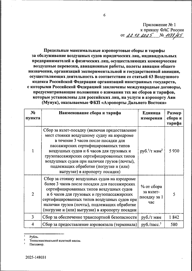 "ОБ УТВЕРЖДЕНИИ ПРЕДЕЛЬНЫХ МАКСИМАЛЬНЫХ АЭРОПОРТОВЫХ СБОРОВ И ТАРИФОВ ЗА ОБСЛУЖИВАНИЕ ВОЗДУШНЫХ СУДОВ ЮРИДИЧЕСКИХ ЛИЦ, ИНДИВИДУАЛЬНЫХ ПРЕДПРИНИМАТЕЛЕЙ И ФИЗИЧЕСКИХ ЛИЦ, ОСУЩЕСТВЛЯЮЩИХ КОММЕРЧЕСКИЕ ВОЗДУШНЫЕ ПЕРЕВОЗКИ, АВИАЦИОННЫЕ РАБОТЫ, ПОЛЕТЫ АВИАЦИИ ОБЩЕГО НАЗНАЧЕНИЯ, ОРГАНИЗАЦИЙ ЭКСПЕРИМЕНТАЛЬНОЙ И ГОСУДАРСТВЕННОЙ АВИАЦИИ, ОСУЩЕСТВЛЯЮЩИХ ДЕЯТЕЛЬНОСТЬ В СООТВЕТСТВИИ СО СТАТЬЕЙ 63 ВОЗДУШНОГО КОДЕКСА РОССИЙСКОЙ ФЕДЕРАЦИИ ОРГАНИЗАЦИЙ ИНОСТРАННЫХ ГОСУДАРСТВ, С КОТОРЫМИ РОССИЙСКОЙ ФЕДЕРАЦИЕЙ ЗАКЛЮЧЕНЫ МЕЖДУНАРОДНЫЕ ДОГОВОРЫ, ПРЕДУСМАТРИВАЮЩИЕ ПОЛОЖЕНИЯ О ВЗИМАНИИ ТЕХ ЖЕ СБОРОВ И ТАРИФОВ, КОТОРЫЕ УСТАНОВЛЕНЫ ДЛЯ РОССИЙСКИХ ЛИЦ, НА УСЛУГИ В АЭРОПОРТАХ АЯН (МУНУК), БОГОРОДСКОЕ, ЗЕЯ, ОХОТСК, ТЫНДА, ХЕРПУЧИ, ЧУМИКАН, ЭКИМЧАН, ОКАЗЫВАЕМЫЕ ФКП "АЭРОПОРТЫ ДАЛЬНЕГО ВОСТОКА"