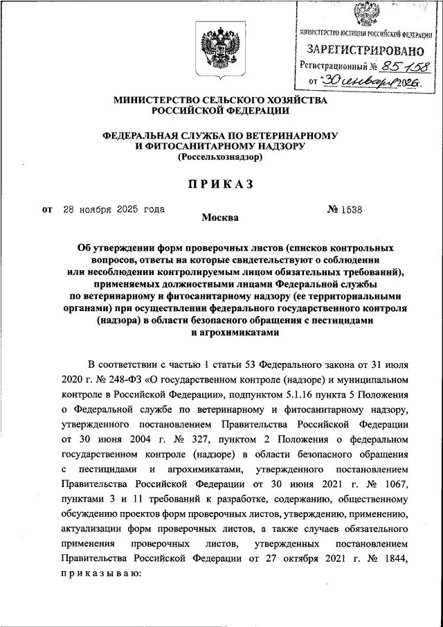 ПРИКАЗ Россельхознадзора от 28.11.2025 N 1538