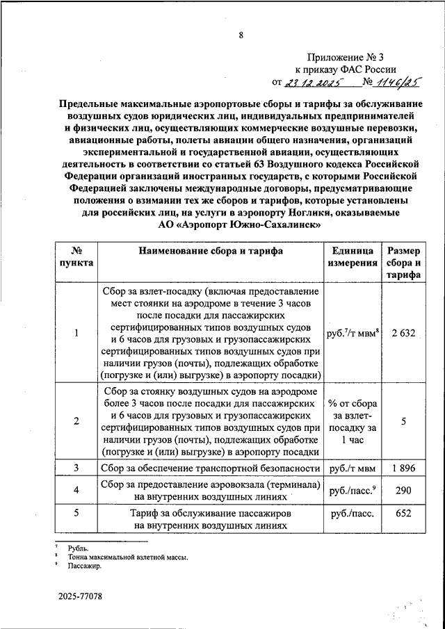 "ОБ УТВЕРЖДЕНИИ ПРЕДЕЛЬНЫХ МАКСИМАЛЬНЫХ АЭРОПОРТОВЫХ СБОРОВ И ТАРИФОВ ЗА ОБСЛУЖИВАНИЕ ВОЗДУШНЫХ СУДОВ ЮРИДИЧЕСКИХ ЛИЦ, ИНДИВИДУАЛЬНЫХ ПРЕДПРИНИМАТЕЛЕЙ И ФИЗИЧЕСКИХ ЛИЦ, ОСУЩЕСТВЛЯЮЩИХ КОММЕРЧЕСКИЕ ВОЗДУШНЫЕ ПЕРЕВОЗКИ, АВИАЦИОННЫЕ РАБОТЫ, ПОЛЕТЫ АВИАЦИИ ОБЩЕГО НАЗНАЧЕНИЯ, ОРГАНИЗАЦИЙ ЭКСПЕРИМЕНТАЛЬНОЙ И ГОСУДАРСТВЕННОЙ АВИАЦИИ, ОСУЩЕСТВЛЯЮЩИХ ДЕЯТЕЛЬНОСТЬ В СООТВЕТСТВИИ СО СТАТЬЕЙ 63 ВОЗДУШНОГО КОДЕКСА РОССИЙСКОЙ ФЕДЕРАЦИИ ОРГАНИЗАЦИЙ ИНОСТРАННЫХ ГОСУДАРСТВ, С КОТОРЫМИ РОССИЙСКОЙ ФЕДЕРАЦИЕЙ ЗАКЛЮЧЕНЫ МЕЖДУНАРОДНЫЕ ДОГОВОРЫ, ПРЕДУСМАТРИВАЮЩИЕ ПОЛОЖЕНИЯ О ВЗИМАНИИ ТЕХ ЖЕ СБОРОВ И ТАРИФОВ, КОТОРЫЕ УСТАНОВЛЕНЫ ДЛЯ РОССИЙСКИХ ЛИЦ, НА УСЛУГИ В АЭРОПОРТАХ ЮЖНО-САХАЛИНСК (ХОМУТОВО), ШАХТЕРСК, НОГЛИКИ, ОХА (НОВОСТРОЙКА), И ПРЕДЕЛЬНЫХ МАКСИМАЛЬНЫХ АЭРОПОРТОВЫХ СБОРОВ ЗА ОБСЛУЖИВАНИЕ ВОЗДУШНЫХ СУДОВ ОСУЩЕСТВЛЯЮЩИХ ДЕЯТЕЛЬНОСТЬ В СООТВЕТСТВИИ СО СТАТЬЕЙ 63 ВОЗДУШНОГО КОДЕКСА РОССИЙСКОЙ ФЕДЕРАЦИИ ОРГАНИЗАЦИЙ ИНОСТРАННЫХ ГОСУДАРСТВ, С КОТОРЫМИ У РОССИЙСКОЙ ФЕДЕРАЦИИ ОТСУТСТВУЮТ ЗАКЛЮЧЕННЫЕ МЕЖДУНАРОДНЫЕ ДОГОВОРЫ, ПРЕДУСМАТРИВАЮЩИЕ ПОЛОЖЕНИЯ О ВЗИМАНИИ ТЕХ ЖЕ СБОРОВ, КОТОРЫЕ УСТАНОВЛЕНЫ ДЛЯ РОССИЙСКИХ ЛИЦ, НА УСЛУГИ В АЭРОПОРТУ ЮЖНО-САХАЛИНСК (ХОМУТОВО), ОКАЗЫВАЕМЫЕ АО "АЭРОПОРТ ЮЖНО-САХАЛИНСК"