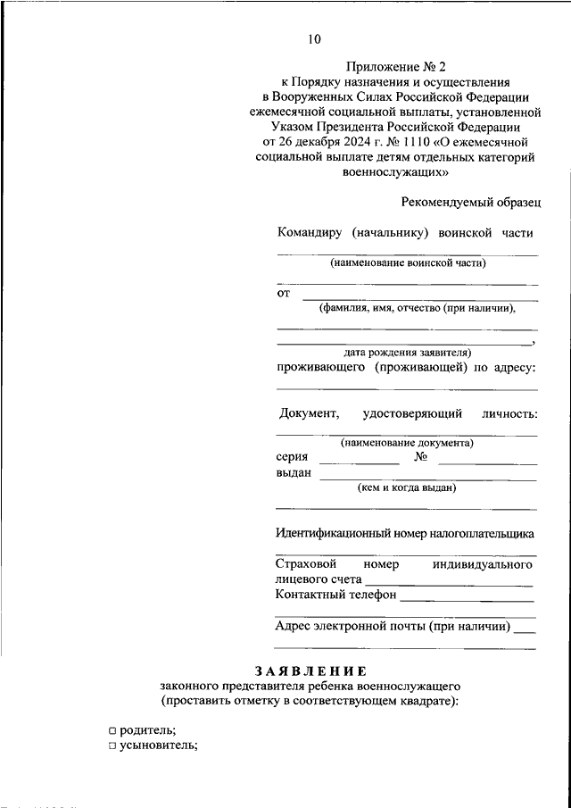 "ОБ ОПРЕДЕЛЕНИИ ПОРЯДКА НАЗНАЧЕНИЯ И ОСУЩЕСТВЛЕНИЯ В ВООРУЖЕННЫХ СИЛАХ РОССИЙСКОЙ ФЕДЕРАЦИИ ЕЖЕМЕСЯЧНОЙ СОЦИАЛЬНОЙ ВЫПЛАТЫ, УСТАНОВЛЕННОЙ УКАЗОМ ПРЕЗИДЕНТА РОССИЙСКОЙ ФЕДЕРАЦИИ ОТ 26 ДЕКАБРЯ 2024 Г. N 1110 "О ЕЖЕМЕСЯЧНОЙ СОЦИАЛЬНОЙ ВЫПЛАТЕ ДЕТЯМ ОТДЕЛЬНЫХ КАТЕГОРИЙ ВОЕННОСЛУЖАЩИХ"