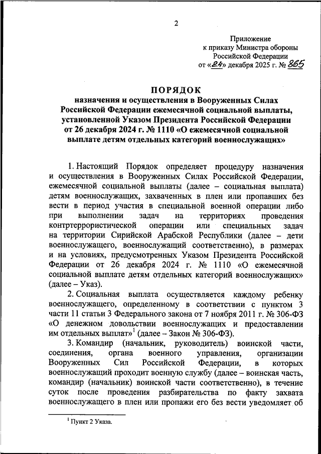 "ОБ ОПРЕДЕЛЕНИИ ПОРЯДКА НАЗНАЧЕНИЯ И ОСУЩЕСТВЛЕНИЯ В ВООРУЖЕННЫХ СИЛАХ РОССИЙСКОЙ ФЕДЕРАЦИИ ЕЖЕМЕСЯЧНОЙ СОЦИАЛЬНОЙ ВЫПЛАТЫ, УСТАНОВЛЕННОЙ УКАЗОМ ПРЕЗИДЕНТА РОССИЙСКОЙ ФЕДЕРАЦИИ ОТ 26 ДЕКАБРЯ 2024 Г. N 1110 "О ЕЖЕМЕСЯЧНОЙ СОЦИАЛЬНОЙ ВЫПЛАТЕ ДЕТЯМ ОТДЕЛЬНЫХ КАТЕГОРИЙ ВОЕННОСЛУЖАЩИХ"
