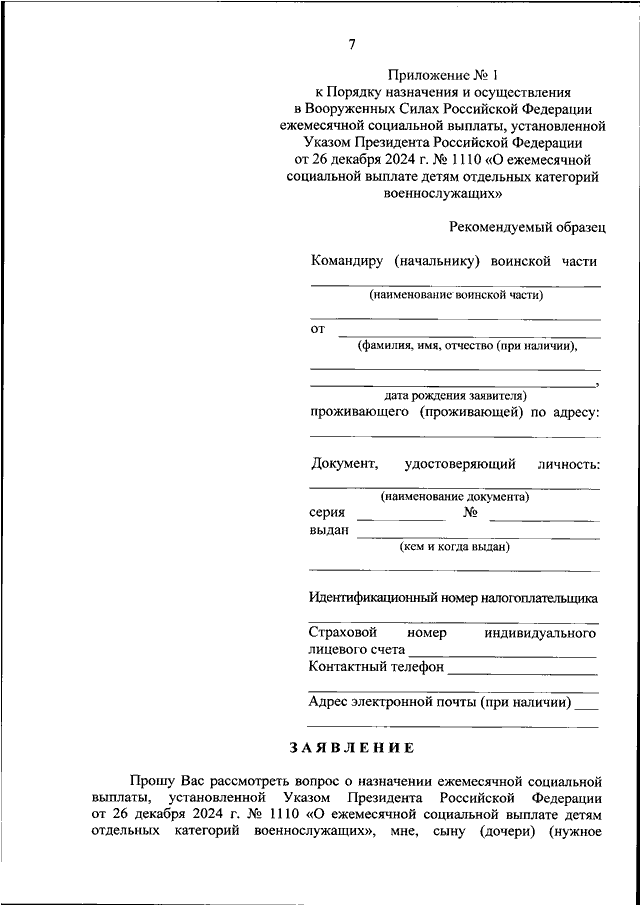 "ОБ ОПРЕДЕЛЕНИИ ПОРЯДКА НАЗНАЧЕНИЯ И ОСУЩЕСТВЛЕНИЯ В ВООРУЖЕННЫХ СИЛАХ РОССИЙСКОЙ ФЕДЕРАЦИИ ЕЖЕМЕСЯЧНОЙ СОЦИАЛЬНОЙ ВЫПЛАТЫ, УСТАНОВЛЕННОЙ УКАЗОМ ПРЕЗИДЕНТА РОССИЙСКОЙ ФЕДЕРАЦИИ ОТ 26 ДЕКАБРЯ 2024 Г. N 1110 "О ЕЖЕМЕСЯЧНОЙ СОЦИАЛЬНОЙ ВЫПЛАТЕ ДЕТЯМ ОТДЕЛЬНЫХ КАТЕГОРИЙ ВОЕННОСЛУЖАЩИХ"