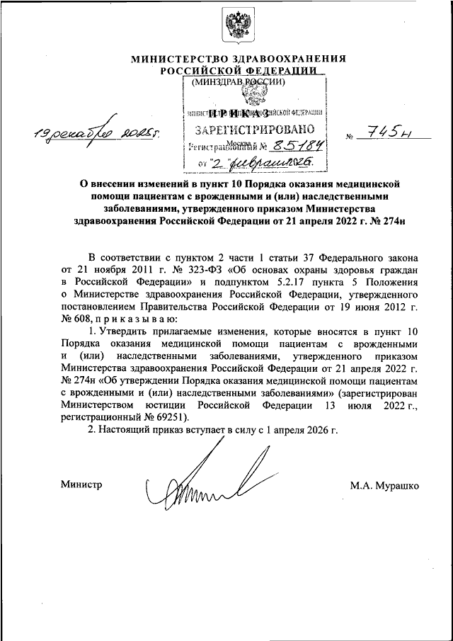 ПРИКАЗ Минздрава РФ от 19.12.2025 N 745н