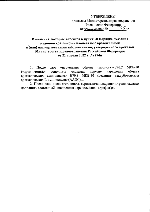 "О ВНЕСЕНИИ ИЗМЕНЕНИЙ В ПУНКТ 10 ПОРЯДКА ОКАЗАНИЯ МЕДИЦИНСКОЙ ПОМОЩИ ПАЦИЕНТАМ С ВРОЖДЕННЫМИ И (ИЛИ) НАСЛЕДСТВЕННЫМИ ЗАБОЛЕВАНИЯМИ, УТВЕРЖДЕННОГО ПРИКАЗОМ МИНИСТЕРСТВА ЗДРАВООХРАНЕНИЯ РОССИЙСКОЙ ФЕДЕРАЦИИ ОТ 21 АПРЕЛЯ 2022 Г. N 274Н"