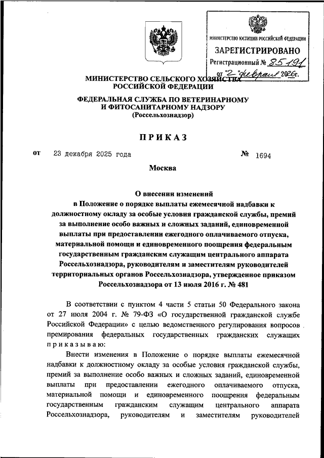 ПРИКАЗ Россельхознадзора от 23.12.2025 N 1694