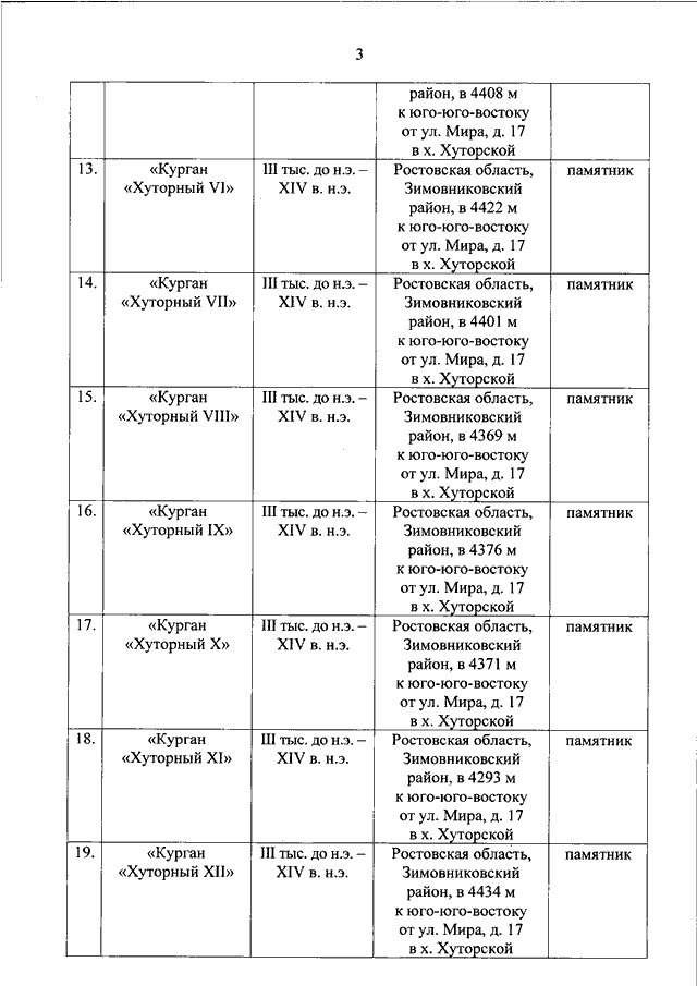 "О ВКЛЮЧЕНИИ ВЫЯВЛЕННЫХ ОБЪЕКТОВ КУЛЬТУРНОГО НАСЛЕДИЯ (ПАМЯТНИКОВ ИСТОРИИ И КУЛЬТУРЫ) НАРОДОВ РОССИЙСКОЙ ФЕДЕРАЦИИ (ОБЪЕКТОВ АРХЕОЛОГИЧЕСКОГО НАСЛЕДИЯ), РАСПОЛОЖЕННЫХ НА ТЕРРИТОРИИ АЗОВСКОГО РАЙОНА, ЗЕРНОГРАДСКОГО РАЙОНА, ЗИМОВНИКОВСКОГО РАЙОНА, КОНСТАНТИНОВСКОГО РАЙОНА, КРАСНОСУЛИНСКОГО РАЙОНА, МАРТЫНОВСКОГО РАЙОНА РОСТОВСКОЙ ОБЛАСТИ, В ЕДИНЫЙ ГОСУДАРСТВЕННЫЙ РЕЕСТР ОБЪЕКТОВ КУЛЬТУРНОГО НАСЛЕДИЯ (ПАМЯТНИКОВ ИСТОРИИ И КУЛЬТУРЫ) НАРОДОВ РОССИЙСКОЙ ФЕДЕРАЦИИ В КАЧЕСТВЕ ОБЪЕКТОВ КУЛЬТУРНОГО НАСЛЕДИЯ (ПАМЯТНИКОВ ИСТОРИИ И КУЛЬТУРЫ) НАРОДОВ РОССИЙСКОЙ ФЕДЕРАЦИИ ФЕДЕРАЛЬНОГО ЗНАЧЕНИЯ И УТВЕРЖДЕНИИ ГРАНИЦ ИХ ТЕРРИТОРИЙ"