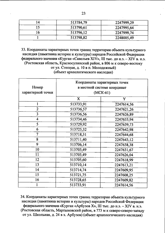 "О ВКЛЮЧЕНИИ ВЫЯВЛЕННЫХ ОБЪЕКТОВ КУЛЬТУРНОГО НАСЛЕДИЯ (ПАМЯТНИКОВ ИСТОРИИ И КУЛЬТУРЫ) НАРОДОВ РОССИЙСКОЙ ФЕДЕРАЦИИ (ОБЪЕКТОВ АРХЕОЛОГИЧЕСКОГО НАСЛЕДИЯ), РАСПОЛОЖЕННЫХ НА ТЕРРИТОРИИ АЗОВСКОГО РАЙОНА, ЗЕРНОГРАДСКОГО РАЙОНА, ЗИМОВНИКОВСКОГО РАЙОНА, КОНСТАНТИНОВСКОГО РАЙОНА, КРАСНОСУЛИНСКОГО РАЙОНА, МАРТЫНОВСКОГО РАЙОНА РОСТОВСКОЙ ОБЛАСТИ, В ЕДИНЫЙ ГОСУДАРСТВЕННЫЙ РЕЕСТР ОБЪЕКТОВ КУЛЬТУРНОГО НАСЛЕДИЯ (ПАМЯТНИКОВ ИСТОРИИ И КУЛЬТУРЫ) НАРОДОВ РОССИЙСКОЙ ФЕДЕРАЦИИ В КАЧЕСТВЕ ОБЪЕКТОВ КУЛЬТУРНОГО НАСЛЕДИЯ (ПАМЯТНИКОВ ИСТОРИИ И КУЛЬТУРЫ) НАРОДОВ РОССИЙСКОЙ ФЕДЕРАЦИИ ФЕДЕРАЛЬНОГО ЗНАЧЕНИЯ И УТВЕРЖДЕНИИ ГРАНИЦ ИХ ТЕРРИТОРИЙ"