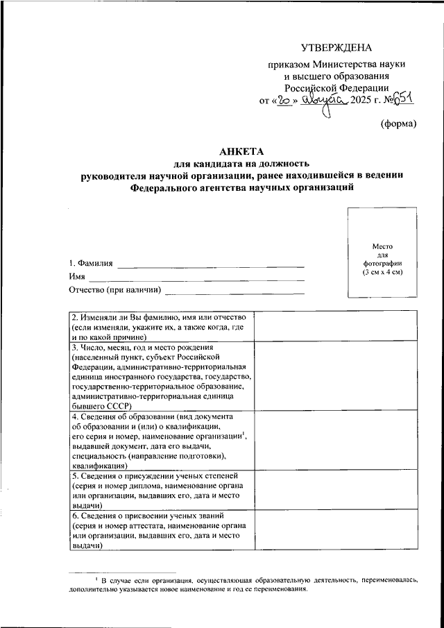 "ОБ УТВЕРЖДЕНИИ ФОРМЫ АНКЕТЫ ДЛЯ КАНДИДАТА НА ДОЛЖНОСТЬ РУКОВОДИТЕЛЯ НАУЧНОЙ ОРГАНИЗАЦИИ, РАНЕЕ НАХОДИВШЕЙСЯ В ВЕДЕНИИ ФЕДЕРАЛЬНОГО АГЕНТСТВА НАУЧНЫХ ОРГАНИЗАЦИЙ"