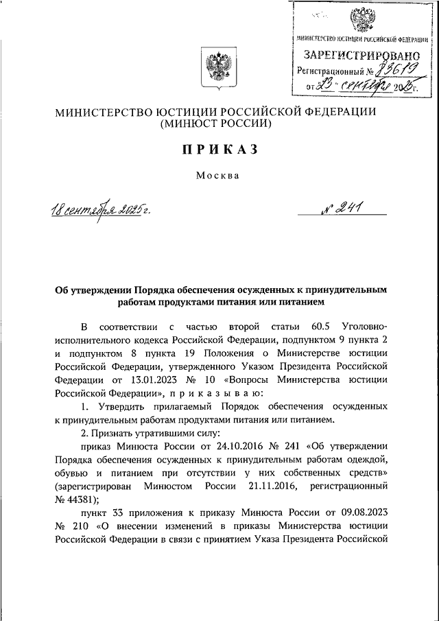 ПРИКАЗ Минюста РФ от 18.09.2025 N 241