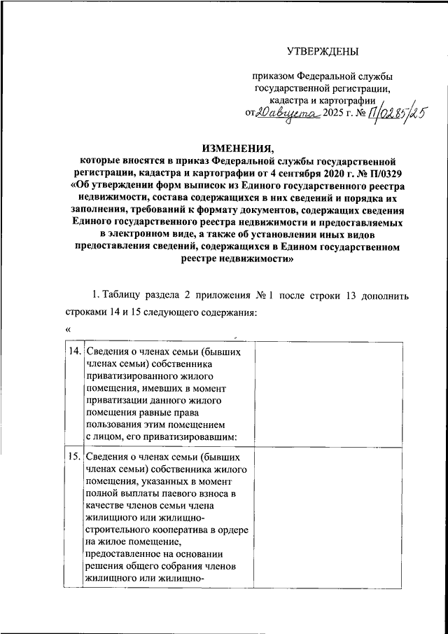 "О ВНЕСЕНИИ ИЗМЕНЕНИЙ В ПРИКАЗ ФЕДЕРАЛЬНОЙ СЛУЖБЫ ГОСУДАРСТВЕННОЙ РЕГИСТРАЦИИ, КАДАСТРА И КАРТОГРАФИИ ОТ 4 СЕНТЯБРЯ 2020 Г. N П/0329 "ОБ УТВЕРЖДЕНИИ ФОРМ ВЫПИСОК ИЗ ЕДИНОГО ГОСУДАРСТВЕННОГО РЕЕСТРА НЕДВИЖИМОСТИ, СОСТАВА СОДЕРЖАЩИХСЯ В НИХ СВЕДЕНИЙ И ПОРЯДКА ИХ ЗАПОЛНЕНИЯ, ТРЕБОВАНИЙ К ФОРМАТУ ДОКУМЕНТОВ, СОДЕРЖАЩИХ СВЕДЕНИЯ ЕДИНОГО ГОСУДАРСТВЕННОГО РЕЕСТРА НЕДВИЖИМОСТИ И ПРЕДОСТАВЛЯЕМЫХ В ЭЛЕКТРОННОМ ВИДЕ, А ТАКЖЕ ОБ УСТАНОВЛЕНИИ ИНЫХ ВИДОВ ПРЕДОСТАВЛЕНИЯ СВЕДЕНИЙ, СОДЕРЖАЩИХСЯ В ЕДИНОМ ГОСУДАРСТВЕННОМ РЕЕСТРЕ НЕДВИЖИМОСТИ"